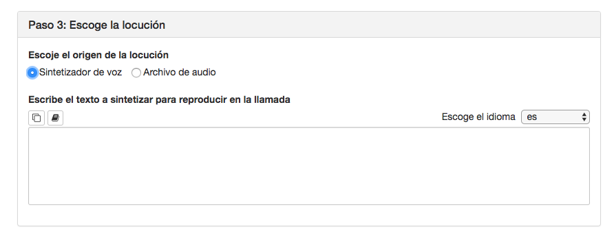 En este paso escogeremos la locución de la llamada, o dicho de otra forma, que escuchará el destinatario cuando descuelgue el teléfono.