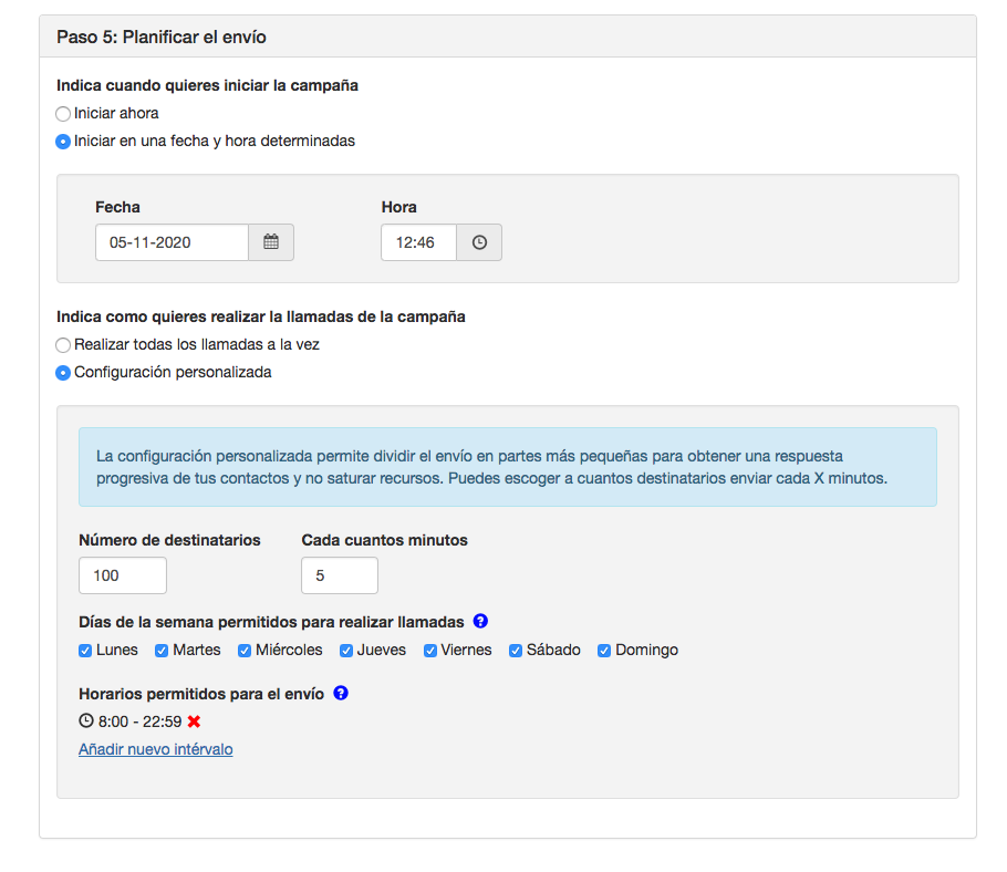 En este paso, elegiremos cuando queremos enviar la campaña y la forma en la que quieres que se realicen las llamadas telefónicas
