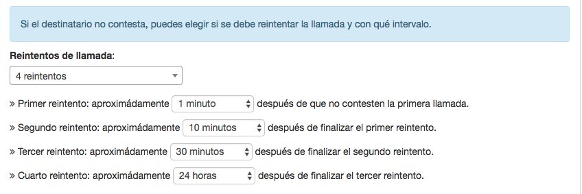 Los reintentos de llamada nos sirven para volver a realizar la llamada si el usuario no contesta. Puedes definir el número de reintentos, con un máximo de 4 y el intervalo de tiempo para realizar cada uno de los reintentos definidos para la llamada.