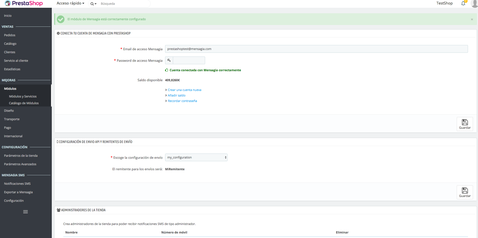 Módulo para Prestashop - Configurar módulo - Mensagia
