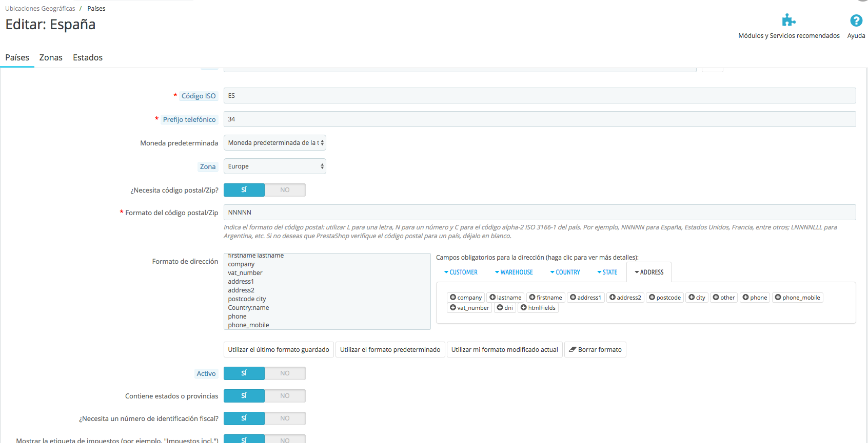 • Se abrirán los campos adicionales para ADDRESS, ahora debes pulsar sobre phone_mobile (o teléfono_móvil) para añadirlo al formato de dirección.